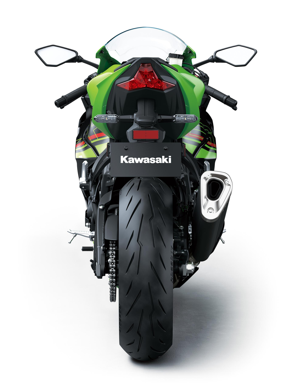 Highly rigid, radial-mount monobloc calipers deliver a firm feel at the lever for superb control. Large Ø 310 mm disc brakes and a radial pump front brake master cylinder complete the front brake package, ensuring powerful braking with excellent feel. A Ø 220 mm disc brake and lightweight caliper slows the rear wheel. New round discs similar in style to those of the Ninja ZX-10R contribute to the strong Ninja ZX family image.