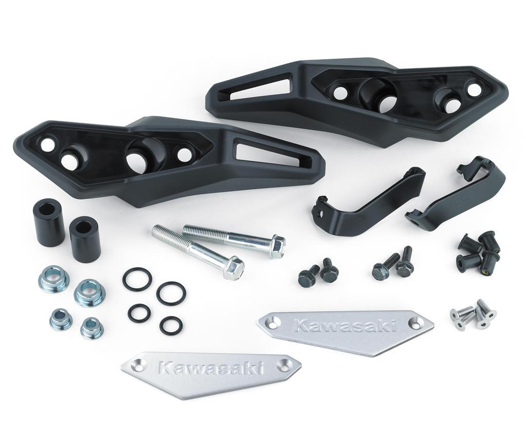 - High-density black ABS plastic Frame Slider Set features the Kawasaki logo and is mounted with factory designed metal brackets